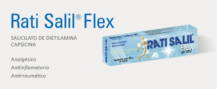 Analgésico, antiinflamatorio y antirreumático de uso externo. Rati Salil Flex está indicado en el tratamiento externo de afecciones de partes blandas: musculares, tendinosas, sinoviales y articulares (miositis, tendinitis, periartritis, lumbalgias, bursitis, etc.), de origen traumático (consecutivos habitualmente a la práctica de deportes o de esfuerzos exagerados) o reumático.